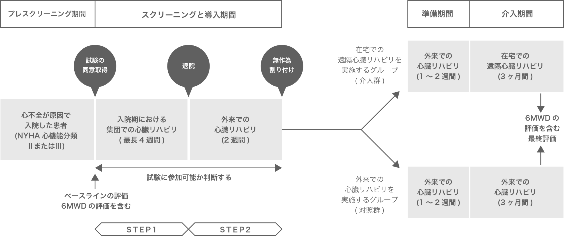 - 介入期間中の脱落リスクを減らすため、導入期間として無作為化前に2週間の外来での集団心臓リハビリを実施し、定期通院が可能であるか(最低4回の実施可否)を評価した(Step 2)。