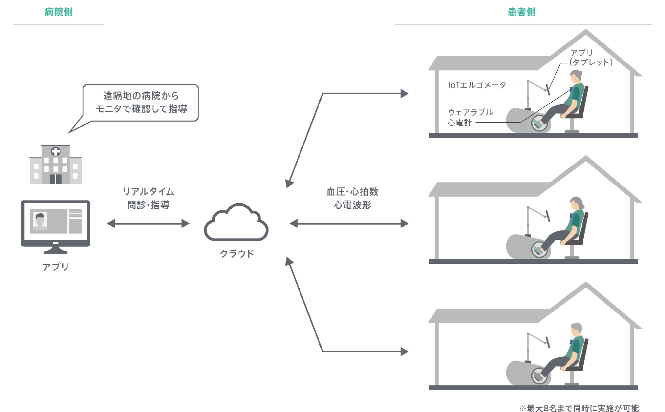 - 医療者はリアルタイムのフィードバックを提供し、最大8人の患者を同時にモニタリング可能である。