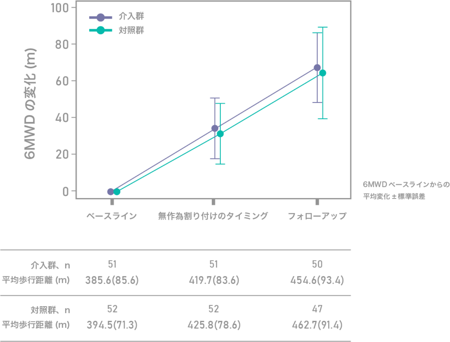 - 試験終了時の6MWDの平均差は、ベースラインと比べて、介入群では67. 3m、対照群では64. 4m延長したが、FASによる有効性の解析では、両群の実際の差は2.9m(95% CI: -27.9‒33.7)であり、非劣性であると判断される条件は満たさなかった。